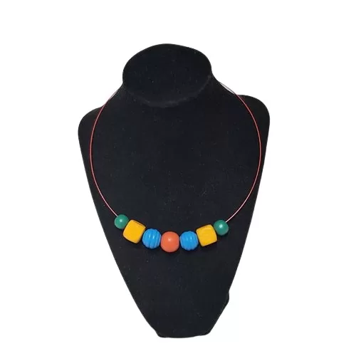 Coliere asamblate manual din mărgele lemn diverse culori, forme și mărimi, pe bază metalică fixă. Mărgelele pot fi scoase și așezate după bunul plac.